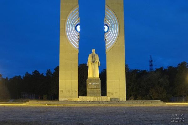 Памятник знаменитому академику-ядерщику был открыт в 1986 году к 250-летию Челябинска около здания Южно-Уральского государственного университета по заказу челябинского горисполкома, председателем которого в то время был Пётр Сумин. Памятник представляет собой сложную архитектурно-скульптурную композицию, в состав которой входят два пилона и находящаяся между ними статуя Курчатова на постаменте. Полусферы на пилонах символизируют расщеплённый атом. Высота пилонов составляет 27 метров. Высота статуи — 6,4 метра. Общая высота памятника (вместе с постаментом) — 11 метров. Автор проекта художник В. А. Авакян, архитекторы Б. В. Петров, В. Л. Глазырин, И. В. Талалай