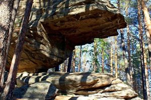 Первая — так называемое «городище каменных фигур», это близ Миасса, где-то на Чашковке. Там есть место, где на поверхность выходят скальные породы, каждый из камней издалека на что-то похож — на черепаху, варана, крокодила, ну и так далее. Выйдя из автобуса на трассе, долго поднимались вверх по просеке. Лес был душный, под конец подъёма промокли насквозь. Фигуры — это интересно, конечно, но вид с хребта, по-моему, круче на порядок.