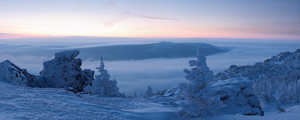 На Ицыле было относительно тепло (-10), но дул сильный ветер, как впрочем и полагается на этой горе. Солнце было скрыто какой-то дымкой, да и уже клонилось к закату.